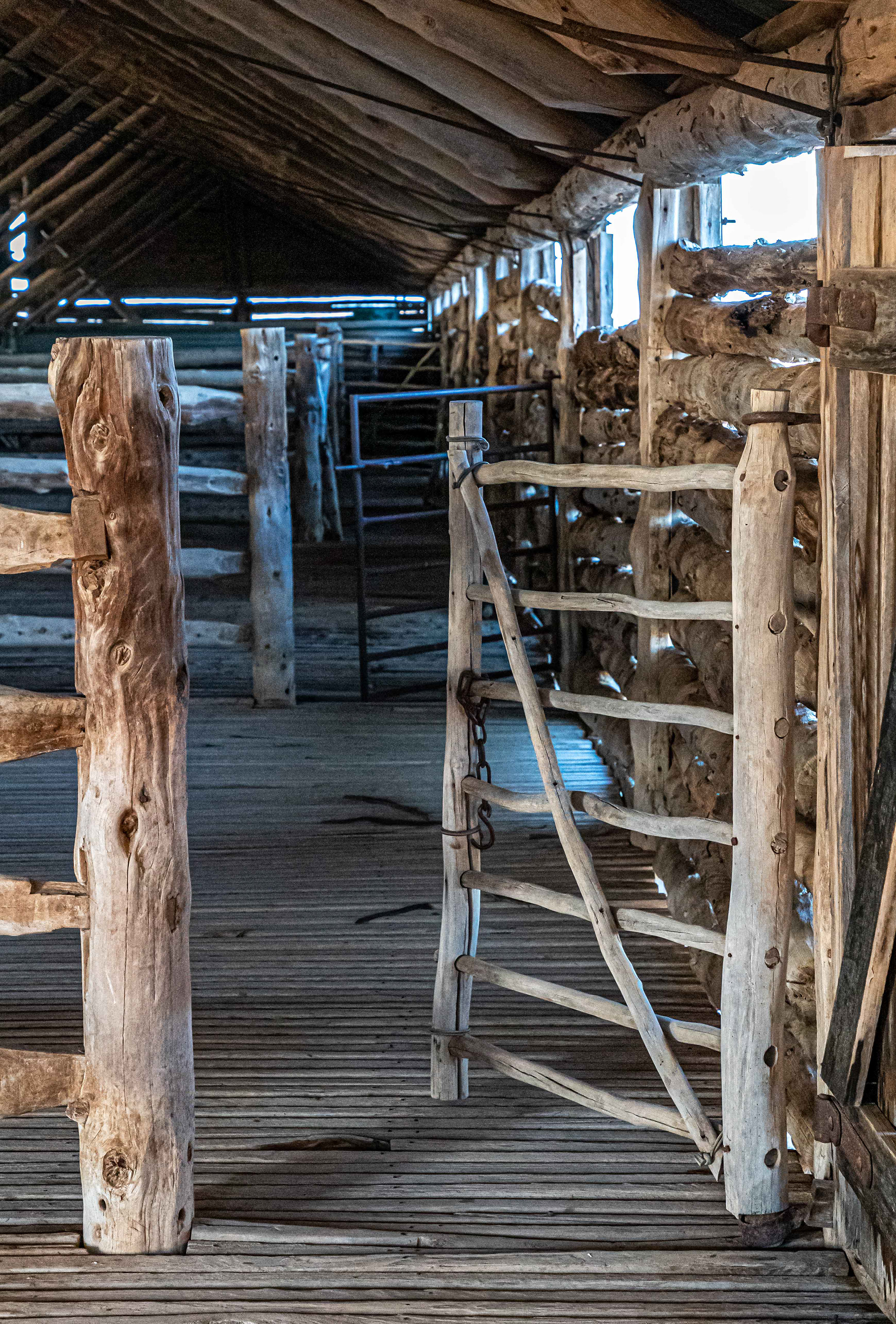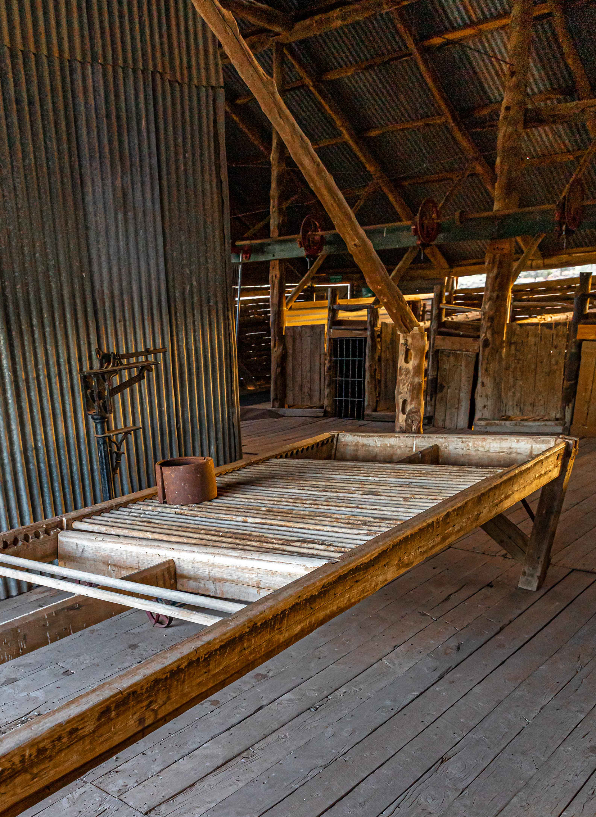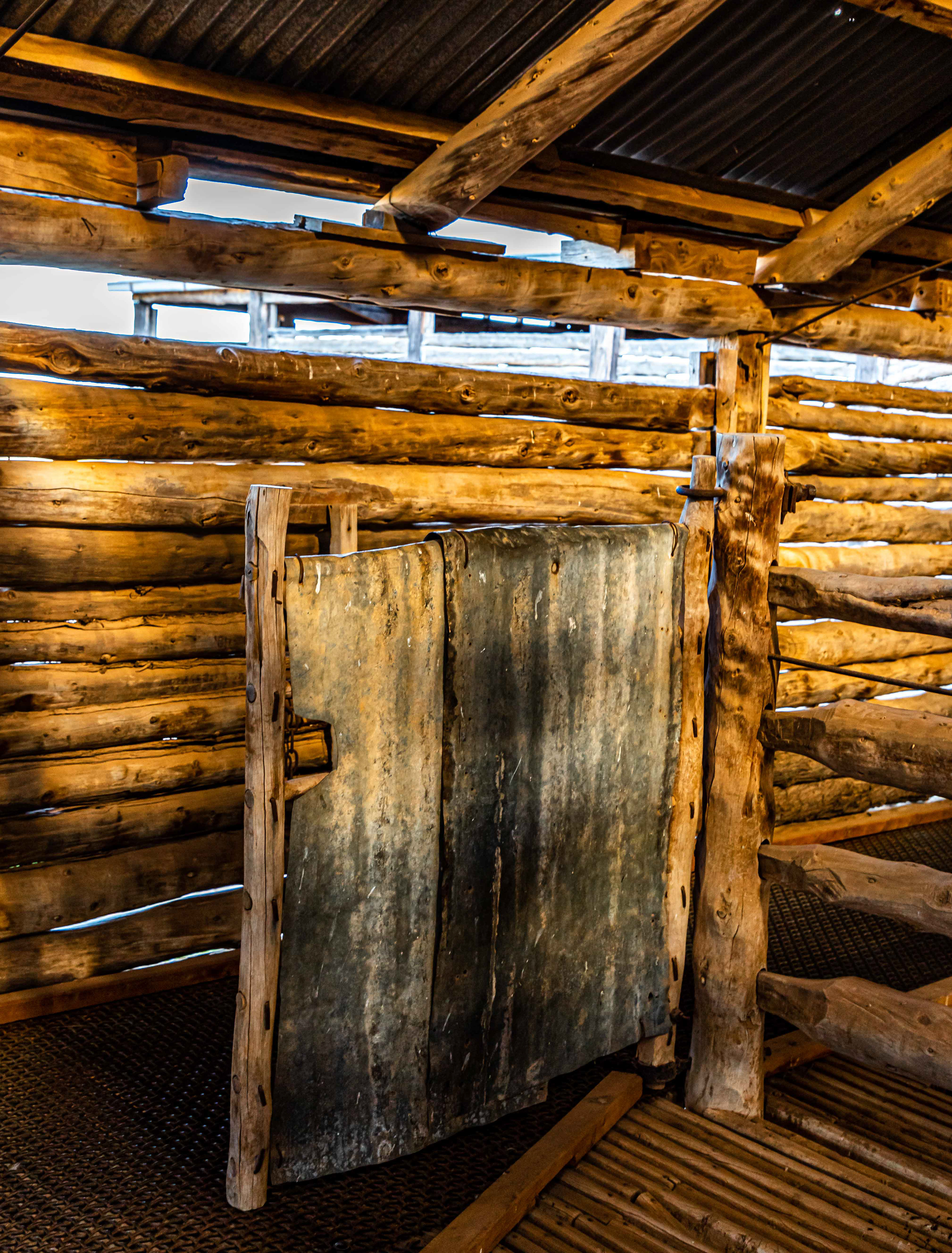 Part of the original shearing stand with the gates connected to the holding pens, from where the individual shearer selected his next victim and the chute into which the shorn sheep was dispatched after shearing.